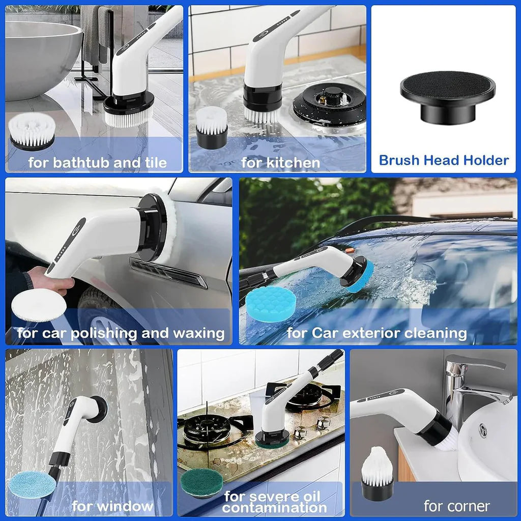 Meet the 7-in-1 Electric Cleaning Brush, your all-in-one solution for a spotless home. Designed to eliminate the need for bending and kneeling, this smart cleaning device effortlessly removes stubborn stains from every corner. Whether youâre tackling bathrooms, kitchens, or windows, it helps you cut cleaning time from 1 hour to just 15 minutes â saving time, energy, and effort.